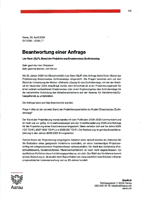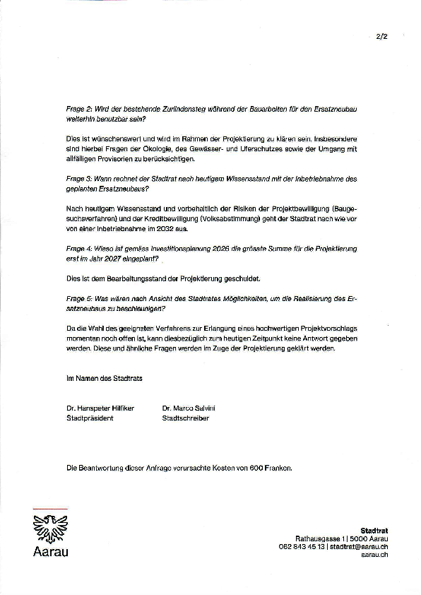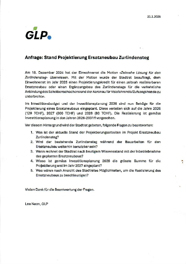 Stand Projektierung Ersatzneubau Zurlindensteg